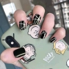 24pcs White Grid Pattern Black False Nail Art Tips Full Cover Fake Nails Glue
