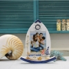 Exquisite wooden freestanding portrait photo frame in the shape of a blue and white seaside cottage / sailing boat shape with shells, light tower and sailing wheel.