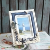 Exquisite wooden freestanding portrait photo frame featuring the white sand beach with shells, seagull and fishnet for seaside holiday.