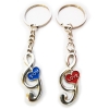 Silver metal couple keyrings / lovers puzzle key chains in music notes with red and blue love hearts design, are novelty and unique gifts for boyfriend / girlfriend, couples, lovers and partners.