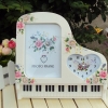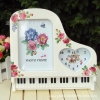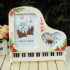 Very beautiful photo frame in the shape of a white grand piano with a little alarm clock on the side.