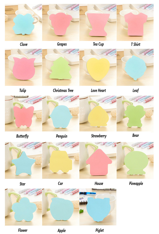 Cute sticky notes available in assorted shapes including apple, strawberry, pineapple, flower, love heart, star, piglet, penguin, house, and many more.