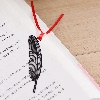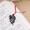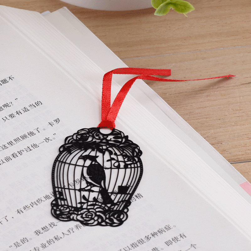 Black metal bookmarks in five different designs: Bird Cage, Leaf, Butterfly, Flower, and Bird Feather.