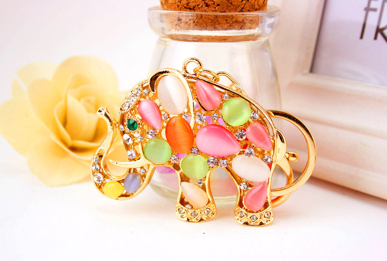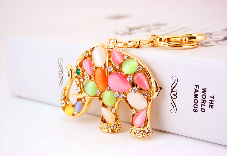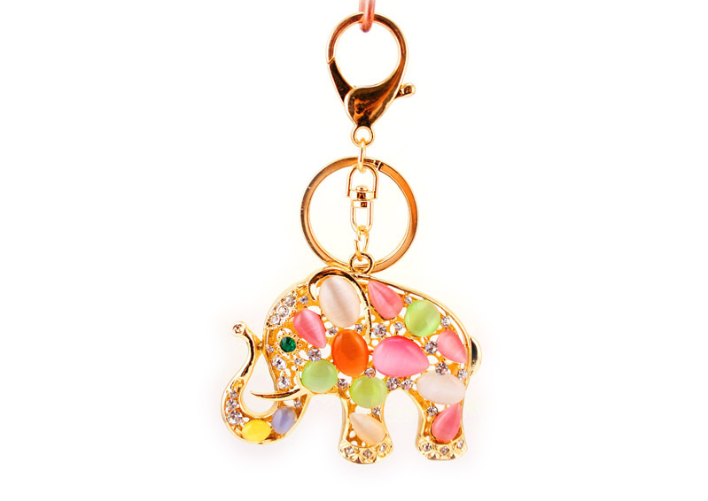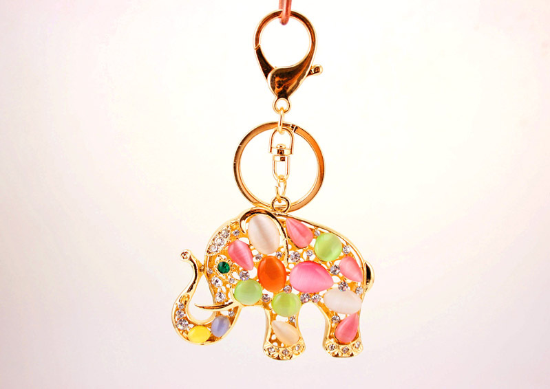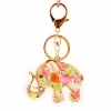 Gold elephant bag charm handbag keyring with colourful sparkling rhinestones.