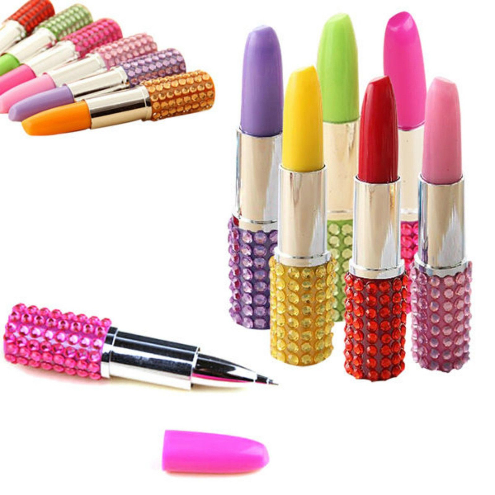 Cute fashion lipstick ballpoint gel pens decorated with sparkling diamante rhinestones, available in assorted colours.
