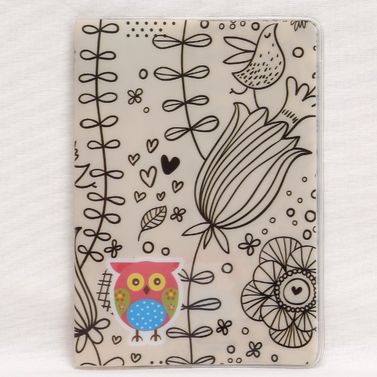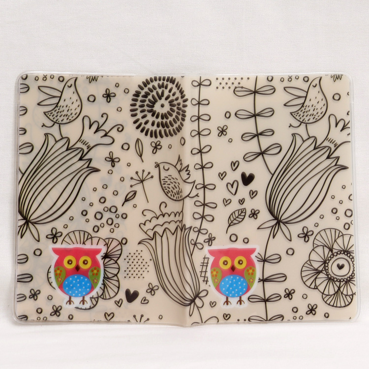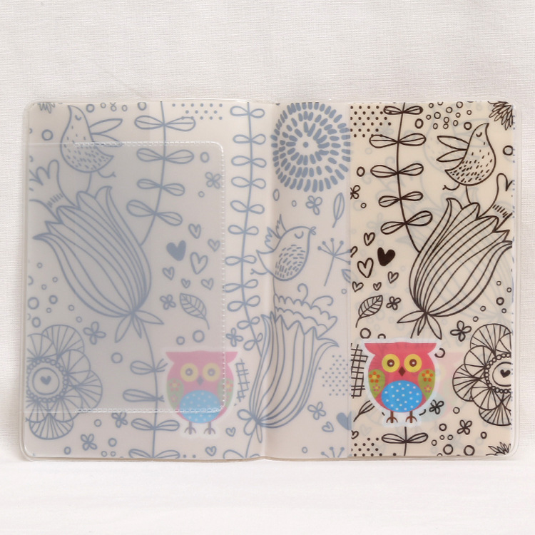 Cute passport cover travel ID holder with adroable owls, garden birds and flowers