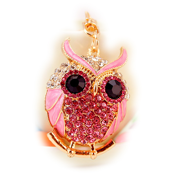 A very unique and cute pink owl with big black rhinestone eyes and decorated by sparkling crystal diamantes.