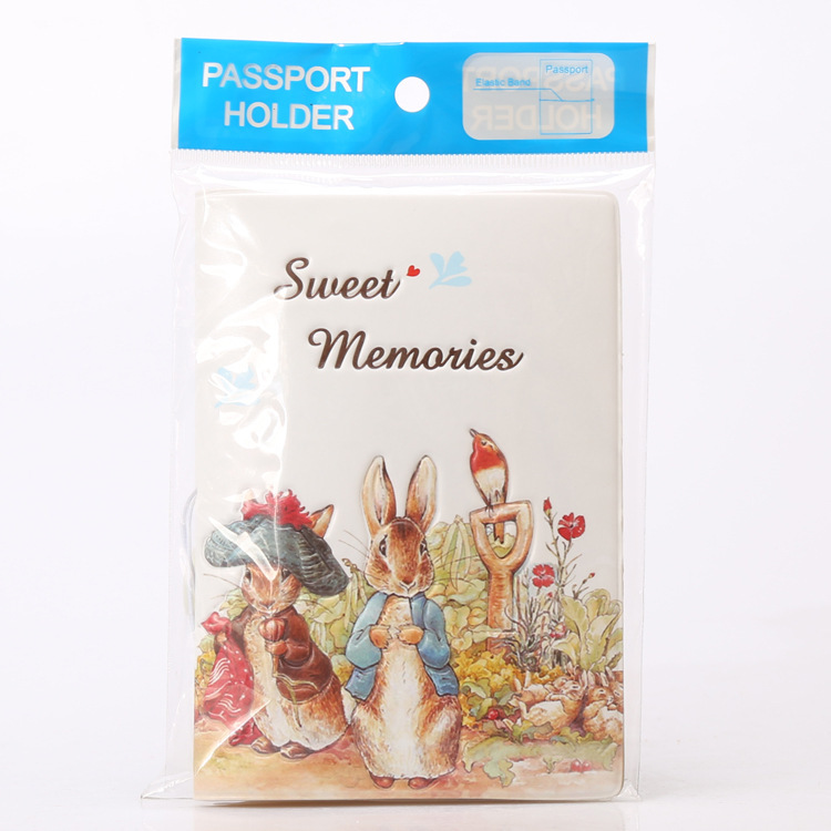 Very cute rabbits in garden with robin bird PU leather passport cover with removable wristlet strap.